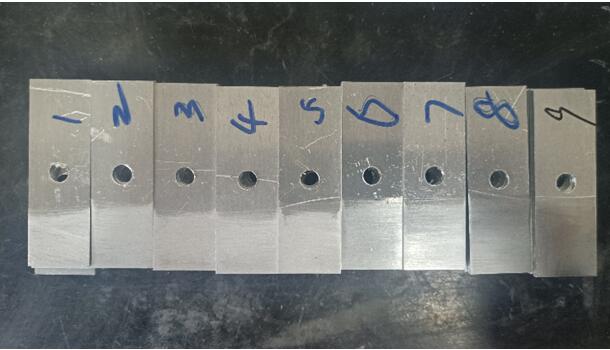 我們選取的砂布目數(shù)為:60、120、180、320、600、800、1200、1500、2000。我們分別按1-9給這個(gè)試片進(jìn)行排序。1代表60目,2代表120目...,我們能從打磨痕跡看出,號(hào)數(shù)越大的,打磨越細(xì)膩,1500和2000目砂紙打磨的硬鋁試片基本能呈現(xiàn)出鏡面光澤。(下面的圖片拍攝可能是反光問題,不能看出差異,實(shí)物實(shí)際是很能看出來區(qū)別的,不信你試試,哈哈)