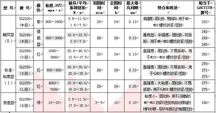 適用于汽車、摩托車、航空發(fā)動機、鐵路機車、礦山機械、采煤設(shè)備、風(fēng)動工具、沖床等螺紋的鎖緊和密封。